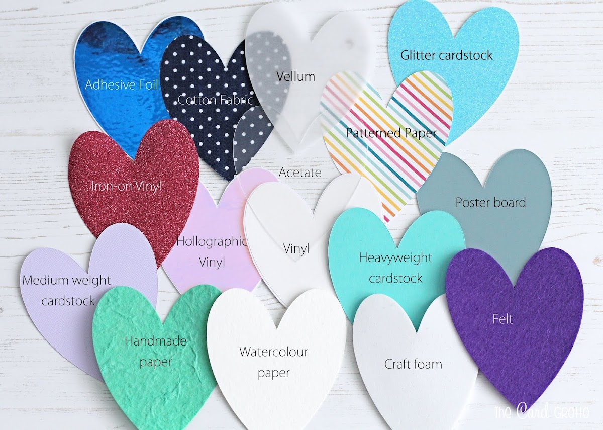 So, we have talked about the tools, now lets talk about what it can cut. It can cut over a hundred different materials. Obviously, I do not have all 100 here to be able to try out but I did cut medium weight cardstock, heavyweight cardstock, poster board, patterned paper, handmade paper, vellum, watercolour paper, glitter cardstock, acetate, felt, craft foam, regular vinyl, iron-on vinyl, holographic vinyl, adhesive foil sheet and cotton fabric.
