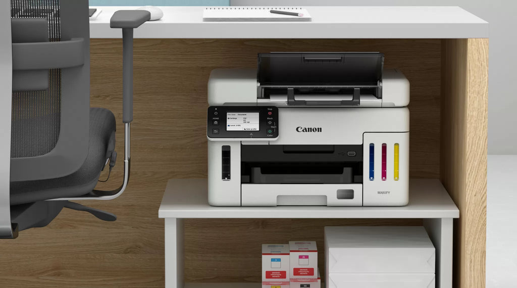 Due to compact practicality design, the MAXIFY GX6560 MegaTank offers the functionality of print, scan, and copy in a compact footprint ideal for budding entrepreneurs or a busy small office.Ā Flatbed scanner can scan up to an A5 size while larger A4 documents can be scanned through the ADF. Fully front operational this printer can fit into smaller spaces with no space needed on either side of the printer.