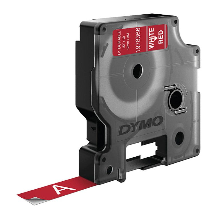 The Genuine Dymo D1 Durable White-on-Red Label Tape 12mm x 3m (1978366) is built for reliable labeling in challenging environments. Featuring an industrial-strength adhesive and a rugged polyester surface, this tape stands up to moisture, chemicals, UV light, and abrasion.