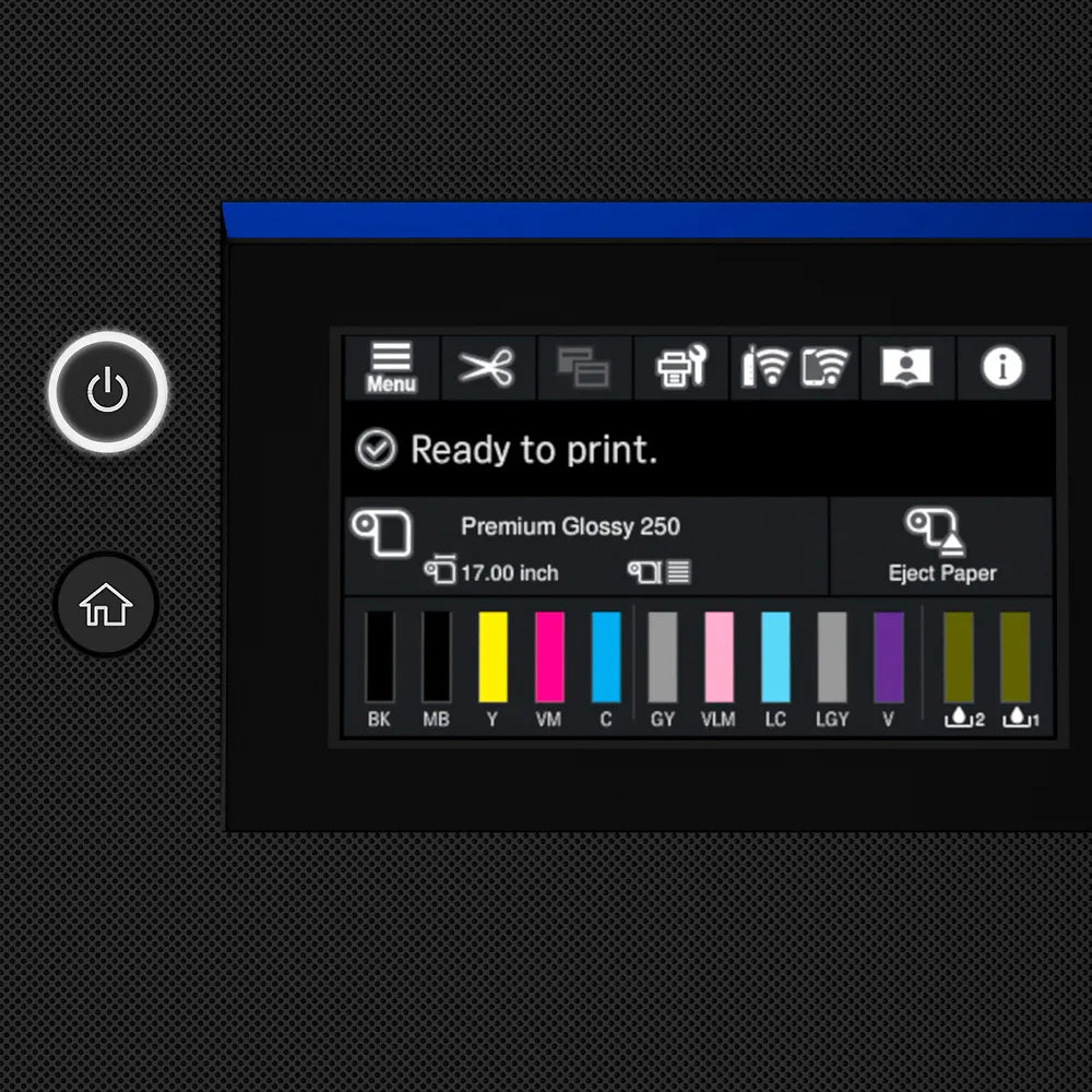 The SC-P5360 has a built-in 4.3" touchscreen with a keypad and gesture navigation that features an impressive touch sensitive customisable LCD display panel which allows you to check the printer status, ink levels and perform routine maintenance tasks along with a variety of other tasks all with a swipe of the screen. You can even set the background to be the print you are printing for an added look.