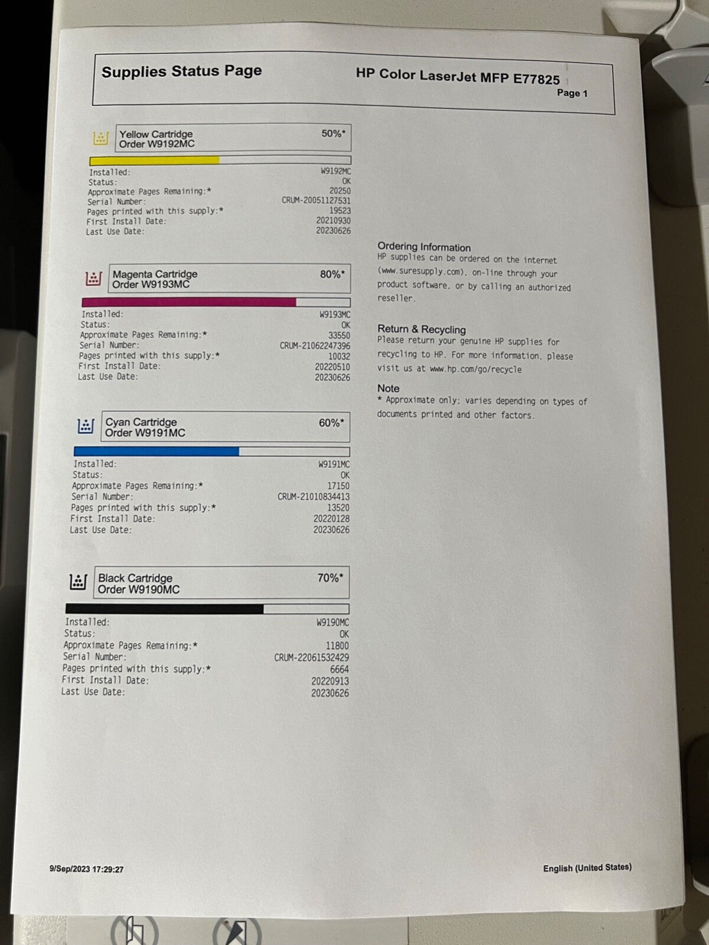 Ex-Demo unit in good working condition, low page count (Only print 51K-54K pages). A set of toner cartridges included, toner level sold as is, see attached photo for details. 3-Months Warranty Included for peace of mind. Toner Level: Magenta 80%, Yellow 60%, Cyan 60%, Black 40%