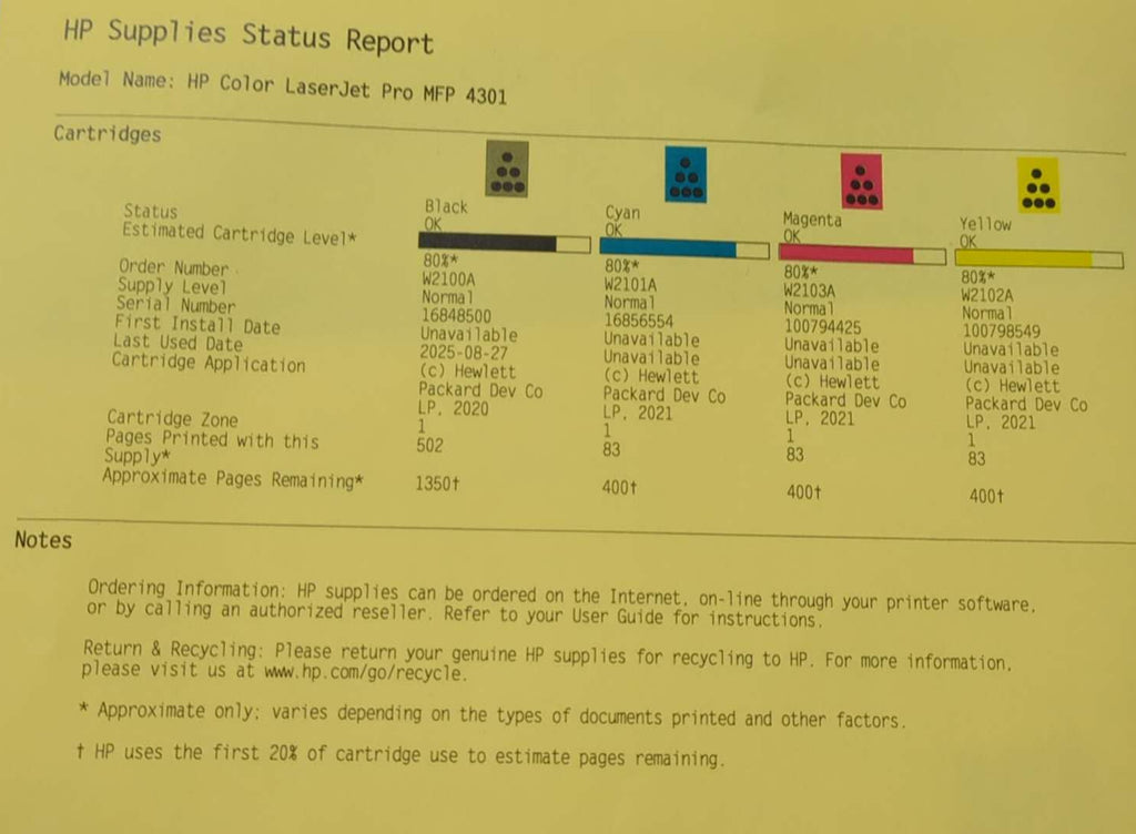 - 4 preinstalled HP LaserJet Toner cartridges (Black: ~2,000 pages, Introductory-Cyan, Magenta, Yellow: ~1,000 pages)
