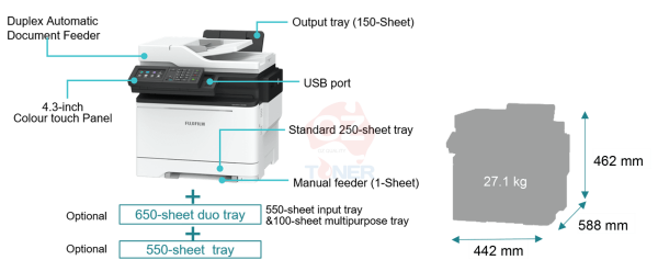 - Optional 650-sheet duo tray with 100-sheet Multipurpose Feeder and 550-sheet Tray supports high-capacity paper feeding of up to 1,451 sheets