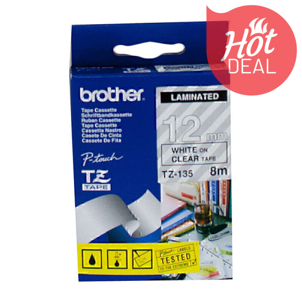 Genuine Brother TZe-135 White on Clear Labelling Tape for PT-P950NW/P910BT/P900W/P750W/P710BT