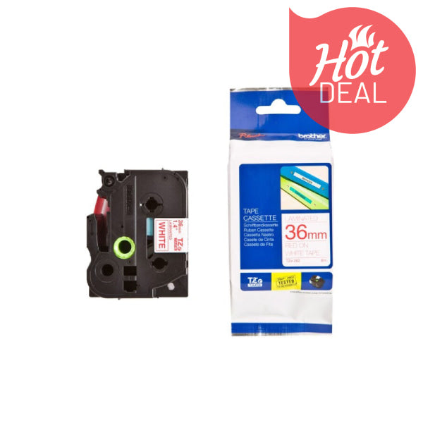 The Genuine Brother TZe-262 Laminated Labelling Tape (36mm x 8m) provides bold red text on a white background for clear, highly visible labels. Designed for Brother P-touch label printers, this laminated tape is resistant to fading, water, chemicals, heat, and abrasion, making it ideal for both office and industrial use.