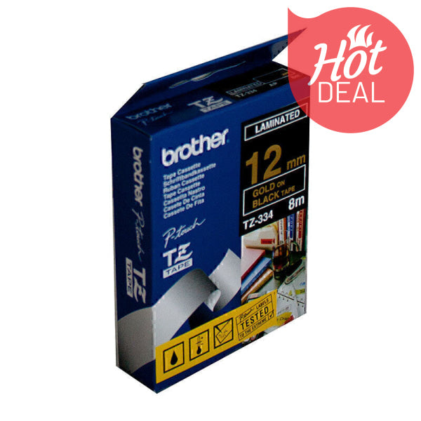 Genuine Brother TZe-334 12mm Gold on Black Labelling Tape (8M) for PT1090/PT1010/PTD200/PTD210