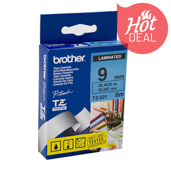 Genuine Brother TZe521 9mm Black on Blue Labelling Tape for PT2430PC/PT7100VP/PTD200/PTD210