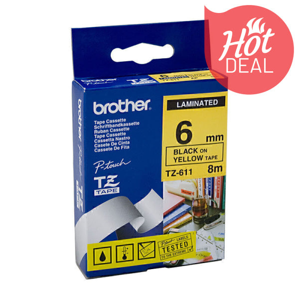Genuine Brother TZe-611 6mm Black on Yellow Labelling Tape (8M) for PT1010/PT1180/PT1280/PT1230PC