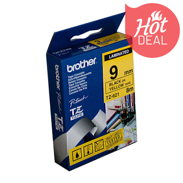 Genuine Brother TZe-621 9mm Black on Yellow Labelling Tape (8M) for PT7100VP/PT900/PTD200/PTD450