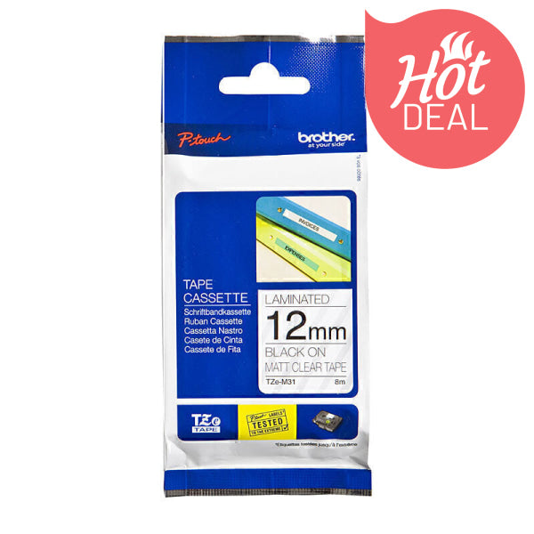 Genuine Brother TZe-M31 12mm Black on Clear matt Luminated Labelling Tape (8M)