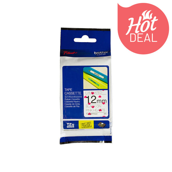 Genuine Brother TZe-MPPH31 12mm x 4m Black-on-Pink-Hearts Luminated Label Tape TZe-MPPH31