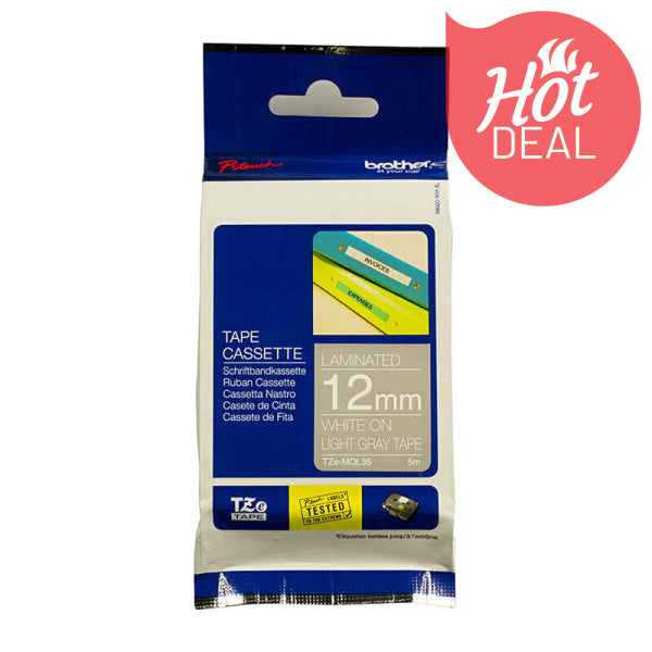 Genuine Brother TZe-MQL35 12mm x 5m White-on-Light-Gray Luminated Label Tape