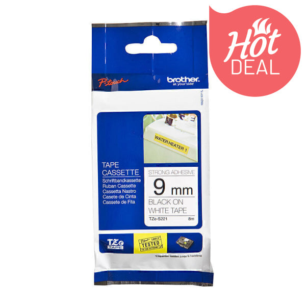 Genuine Brother TZe-S221 9mm Black on White Strong Adhesive Labelling Tape