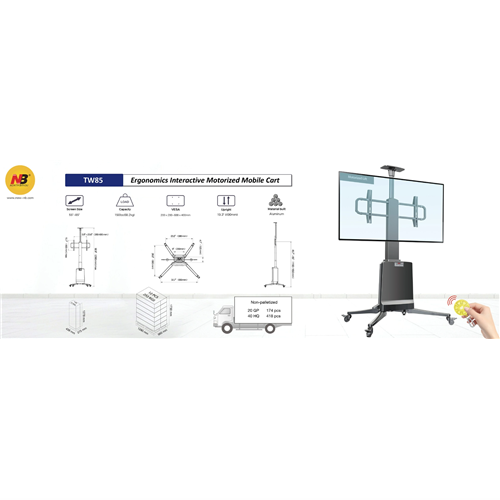 The North Bayou TW-85 is a premium motorised mobile TV cart designed for large displays between 55” to 85”. With quiet electric lift adjustment and industrial-grade stability, it’s ideal for professional settings where mobility, safety, and adjustability are essential.