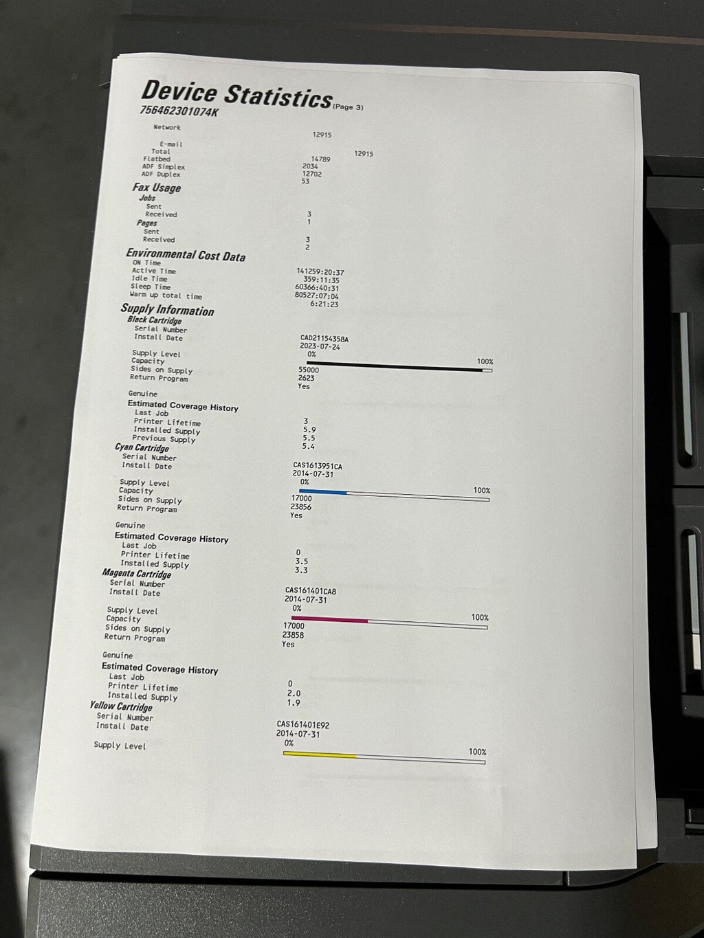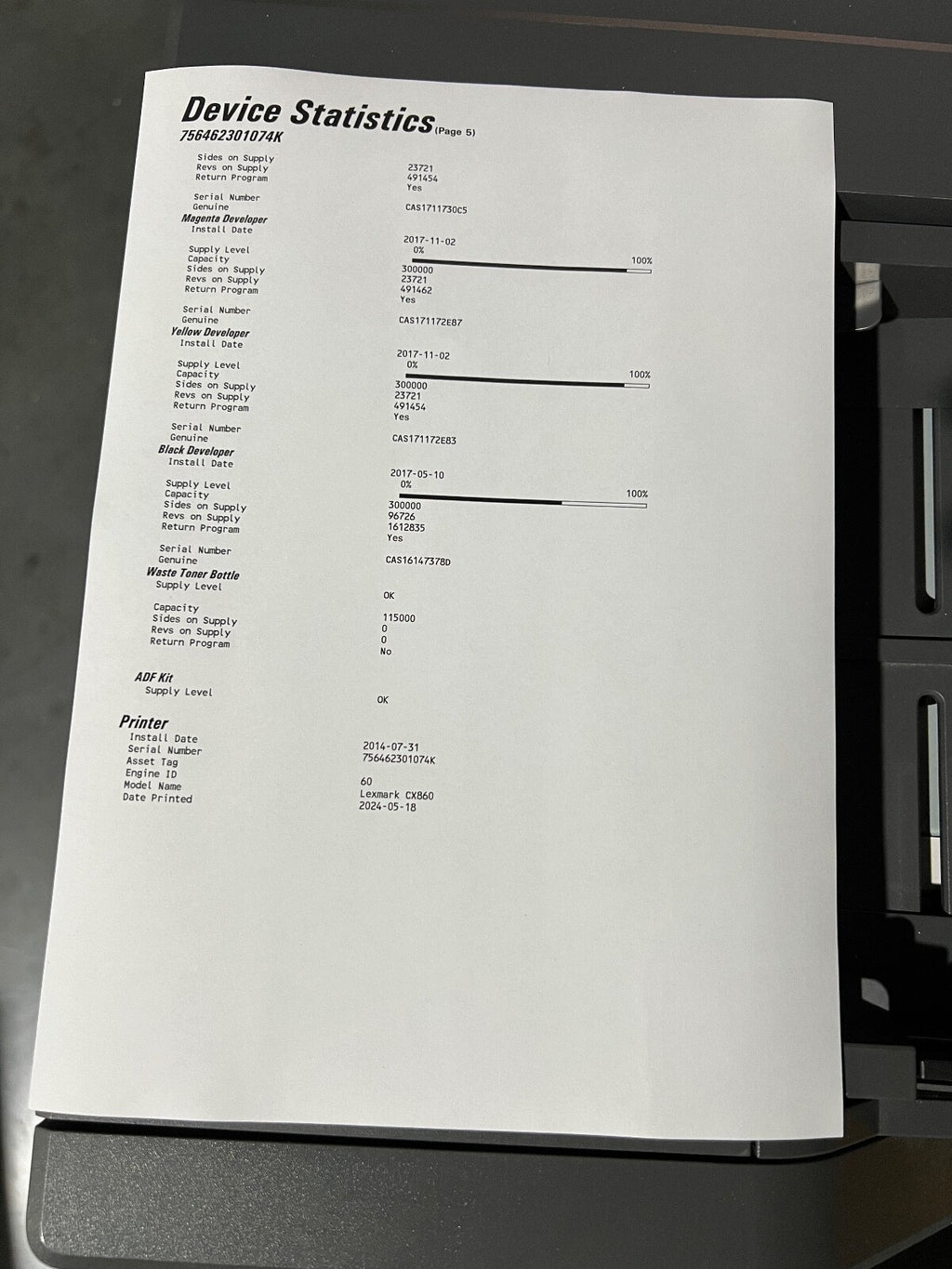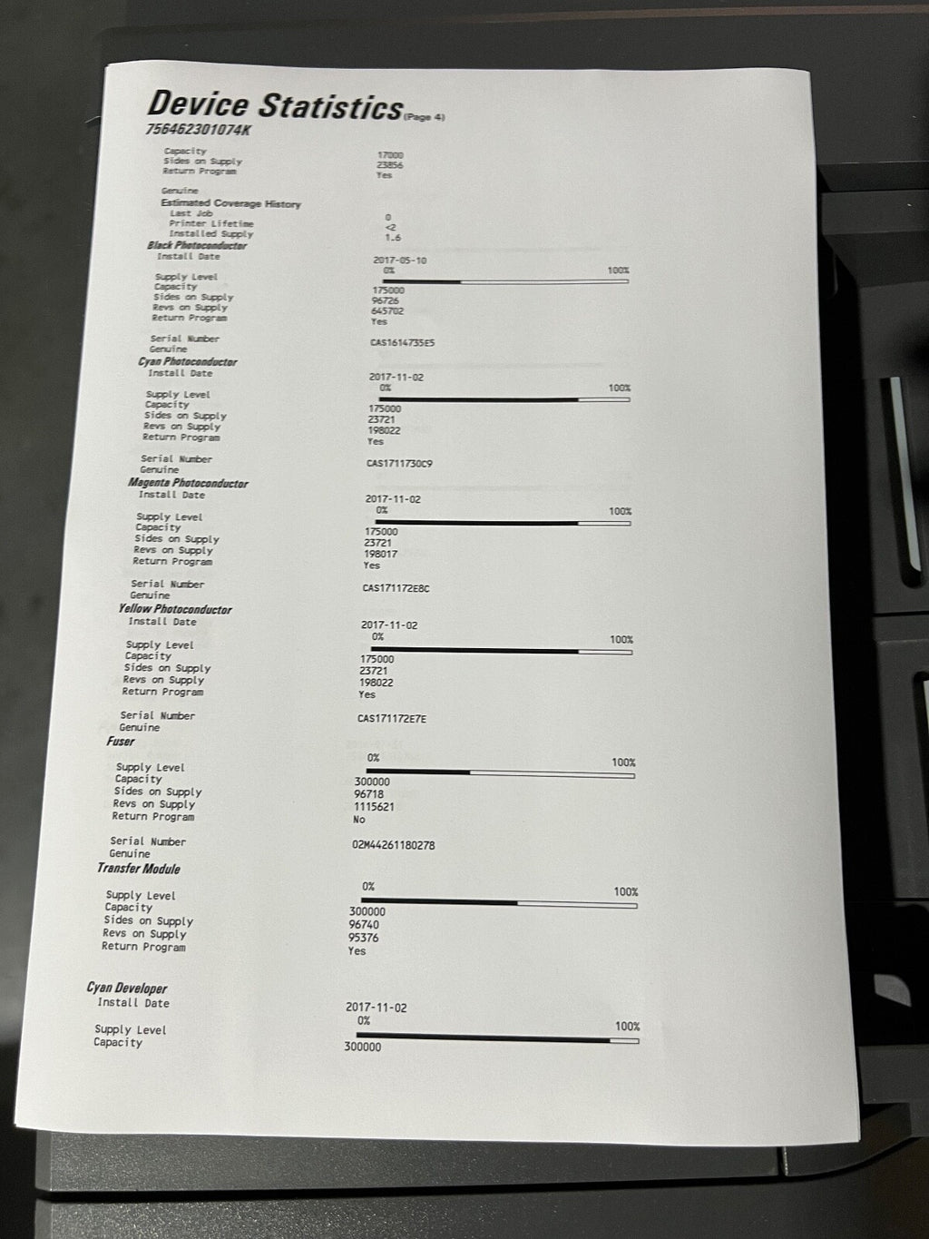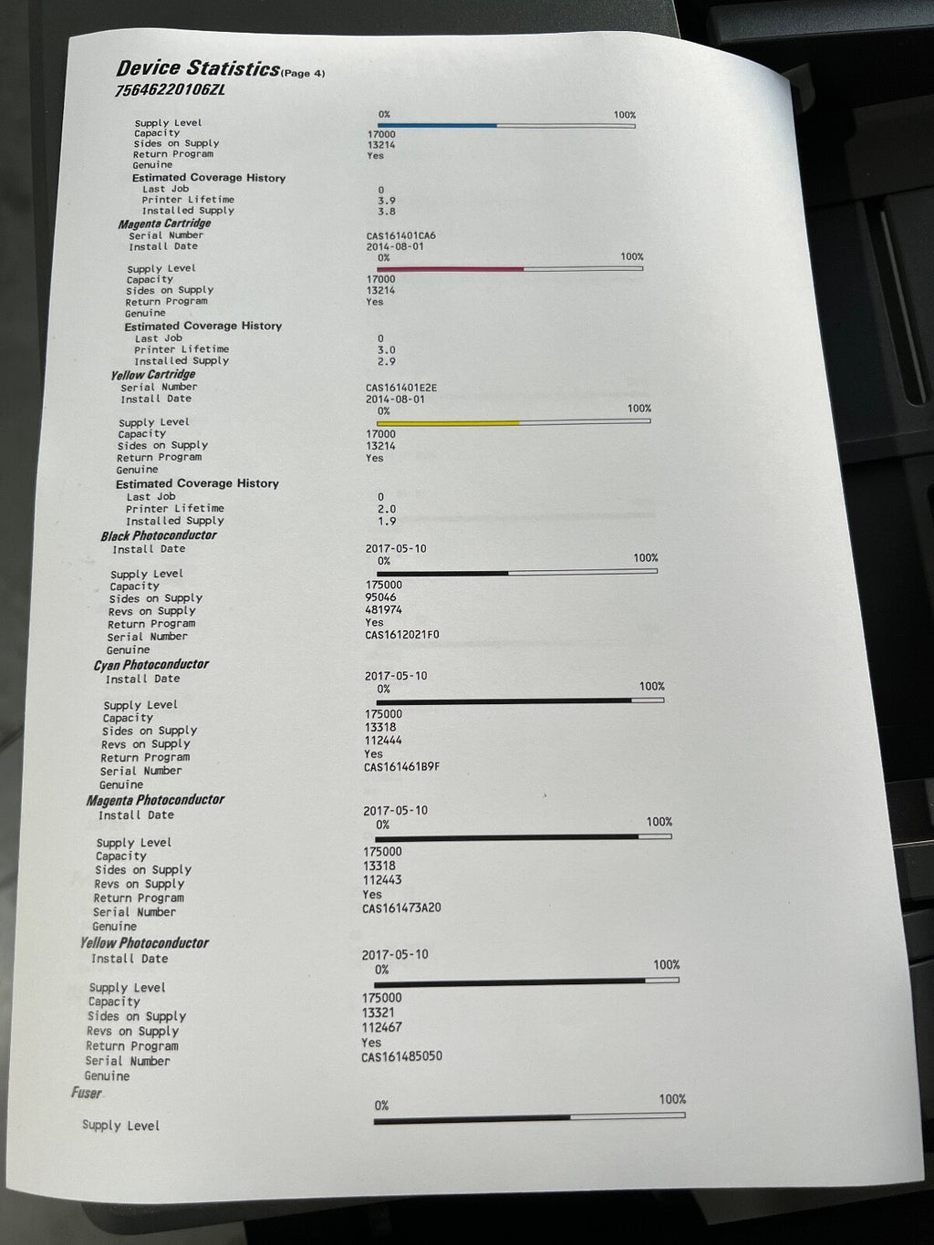 Toner Level (C/M/Y/K): 30%/45%/45%/90% (Please see attached testing pages for other consumables).
