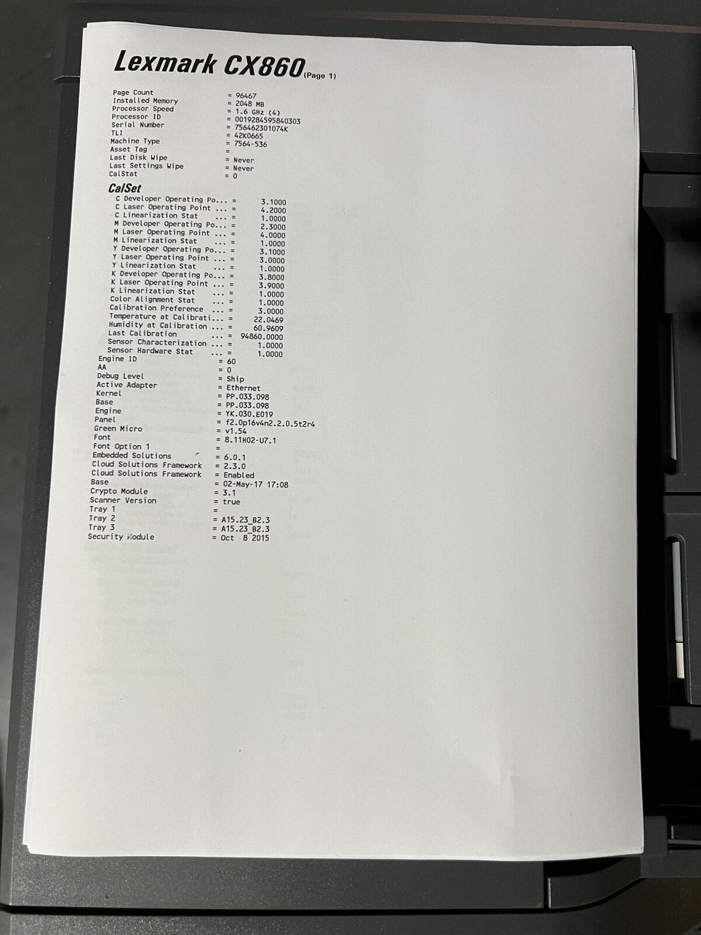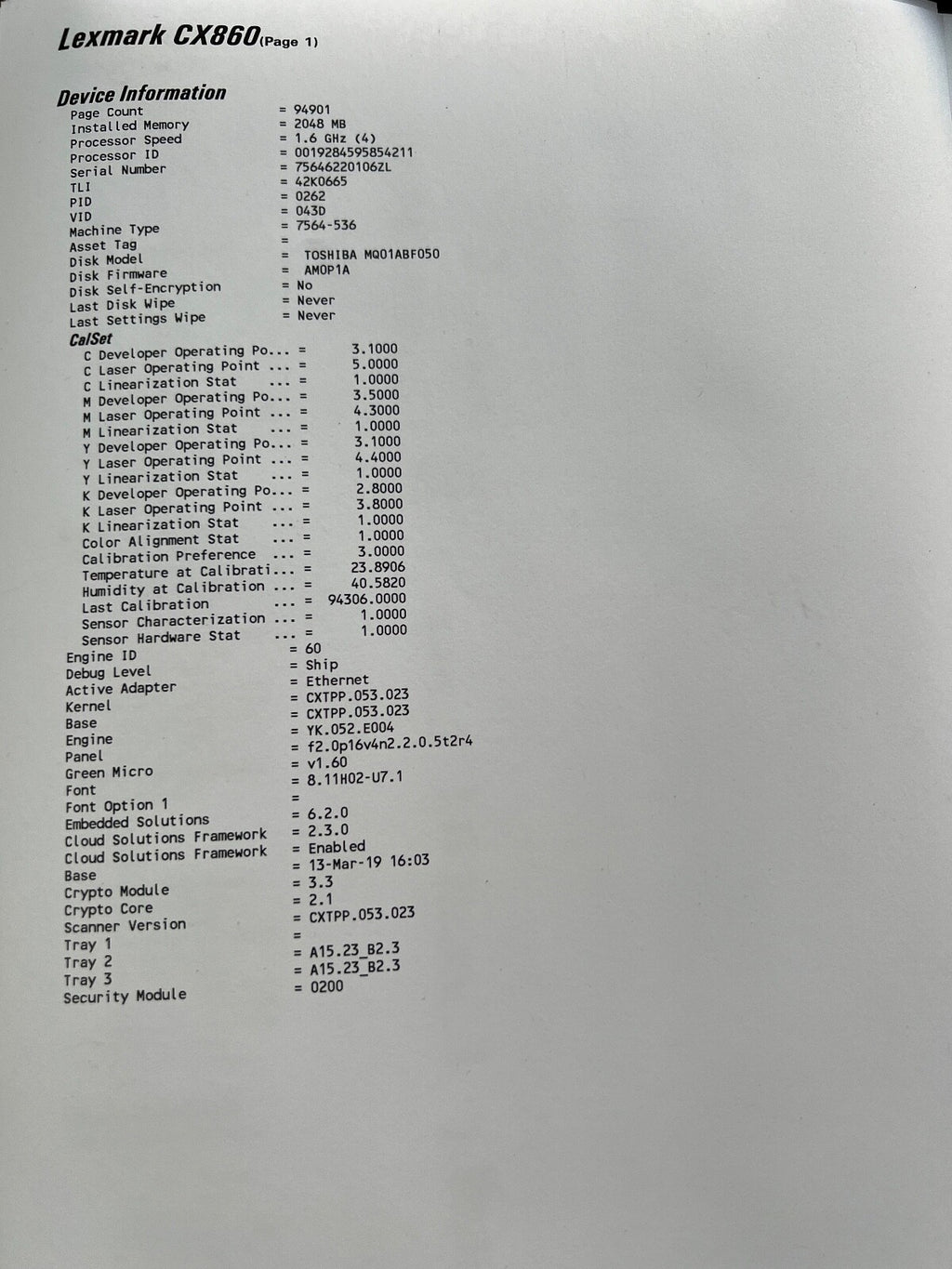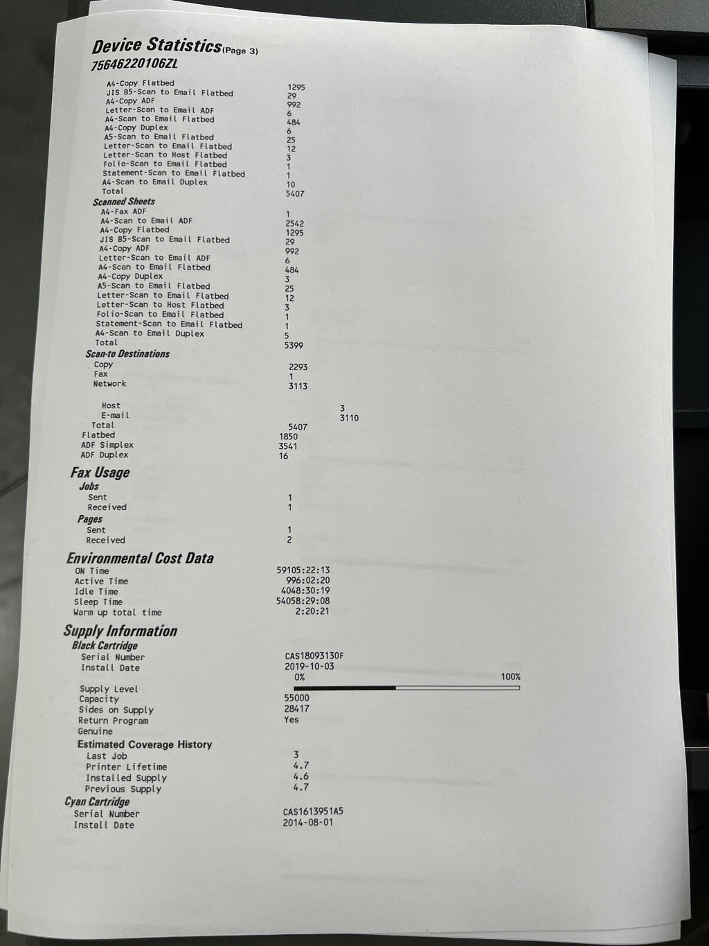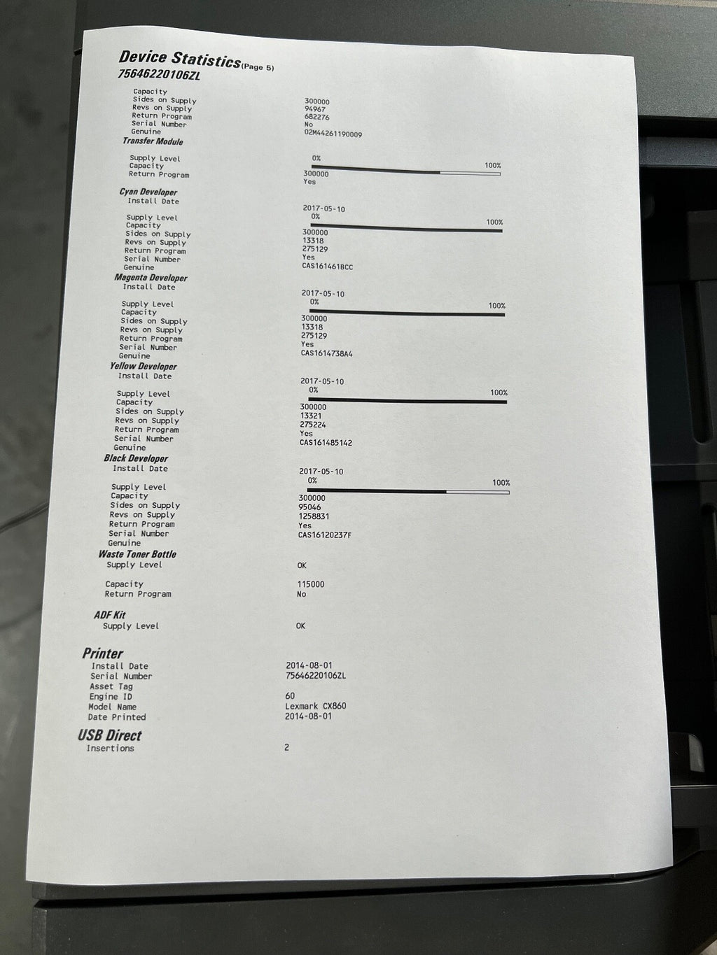 Toner Level (C/M/Y/K): 30%/45%/45%/90% (Please see attached testing pages for other consumables).