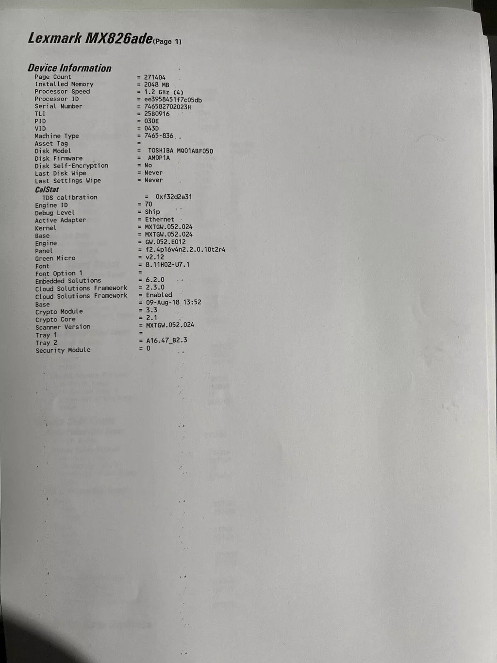 | Specifications | Model | Lexmark MX826ade |