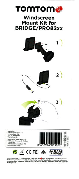 The TomTom RAM Windscreen Mount [9UFI.001.19] is a robust, professional-grade mounting solution designed for TomTom Bridge and PRO 8270/8275 Telematics GPS devices. Featuring the trusted RAM Mount System, it ensures an ultra-stable and adjustable installation ideal for trucks, vans, and buses.