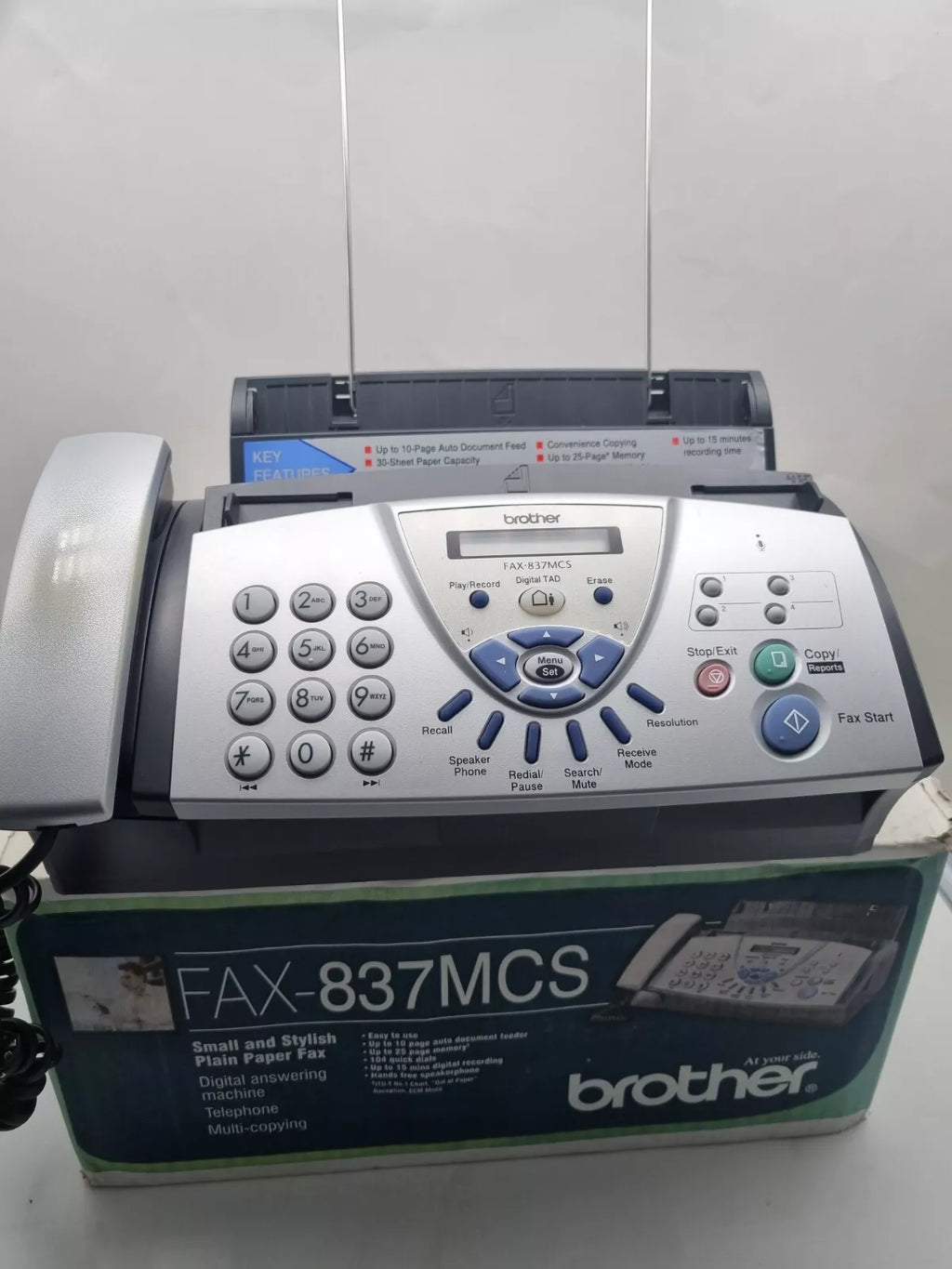 Condition report: Brother FAX-837 MCS Personal Fax Machine Phone and Copier with Extra unopened Thermal Ribbon PC - 402RF. Fast Post from Trusted Australian Seller. Phone has wear and scratching as pictured. Original Box showing weather, instruction manual has writing on it.