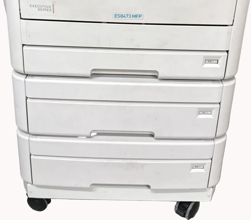 This USED OKI Paper Handling Bundle includes two genuine OKI 535-sheet paper trays and a genuine OKI caster base, designed to expand paper capacity and improve mobility for OKI ES8473 series multifunction printers.